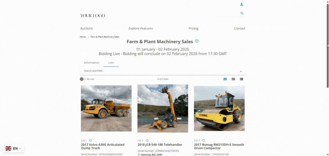 Agricultural & Industrial Auctioneers: Running online auctions for machinery, equipment, vehicles, or industrial assets — and requiring a professional auction platform that reflects your credibility, not a third-party marketplace.